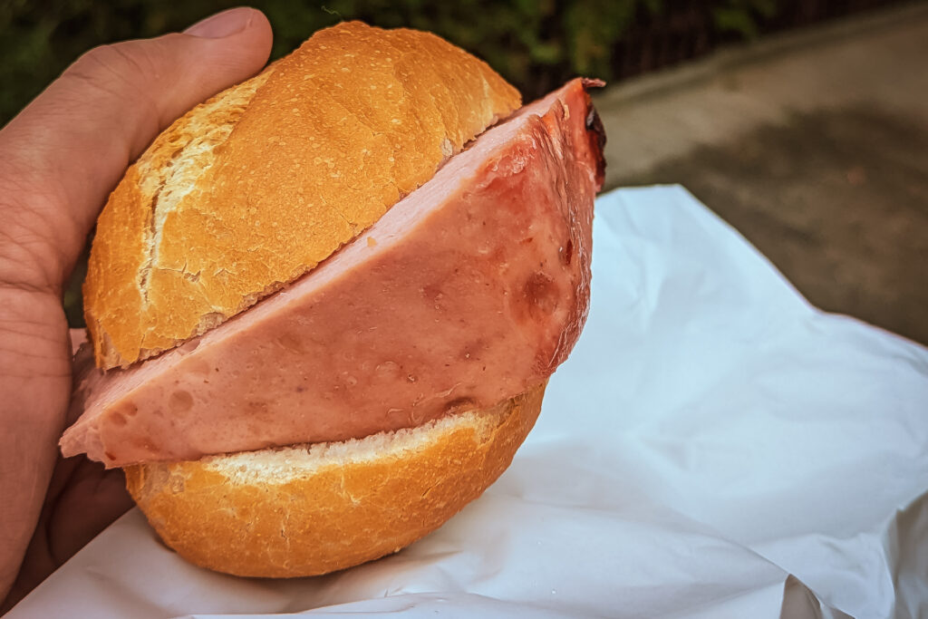 Daher als Momentaufnahme: Eine echte bayrische Leberkässemmel. Das kleine belegte Brötchen gab es vom Metzger direkt auf die Hand.